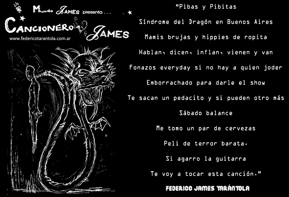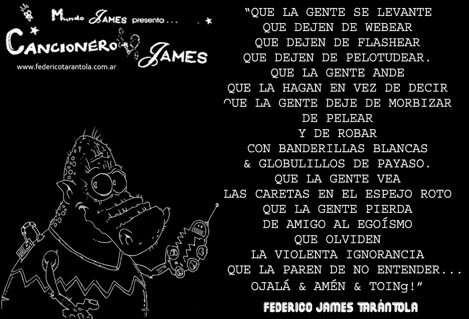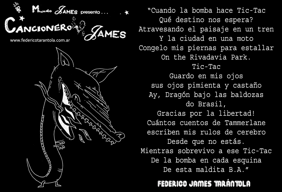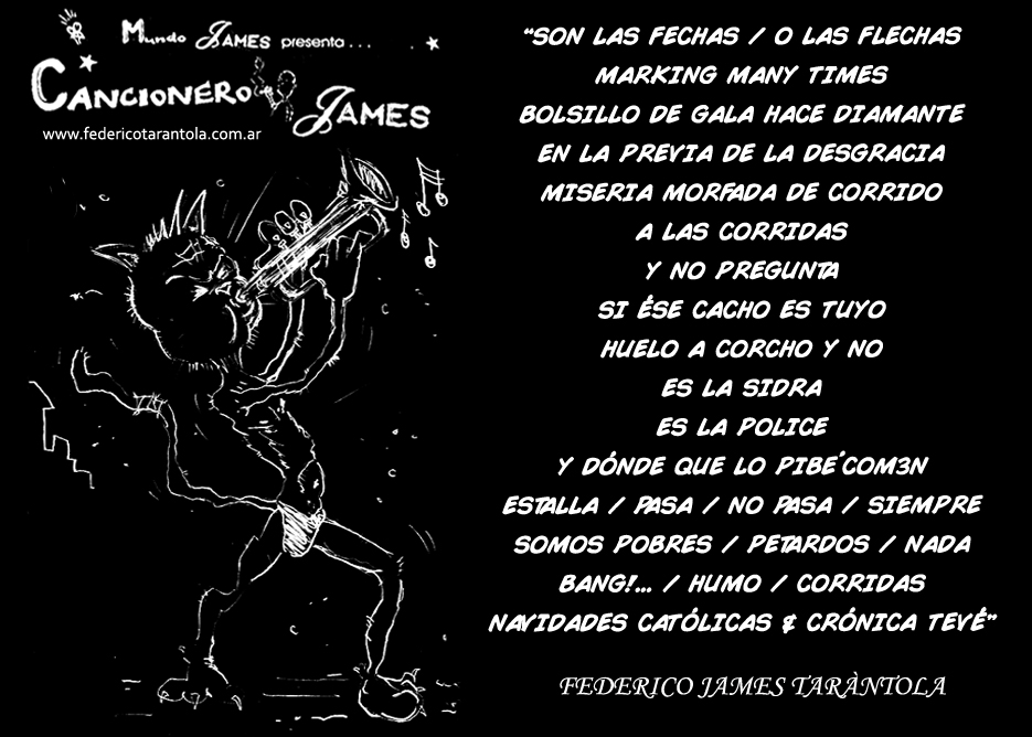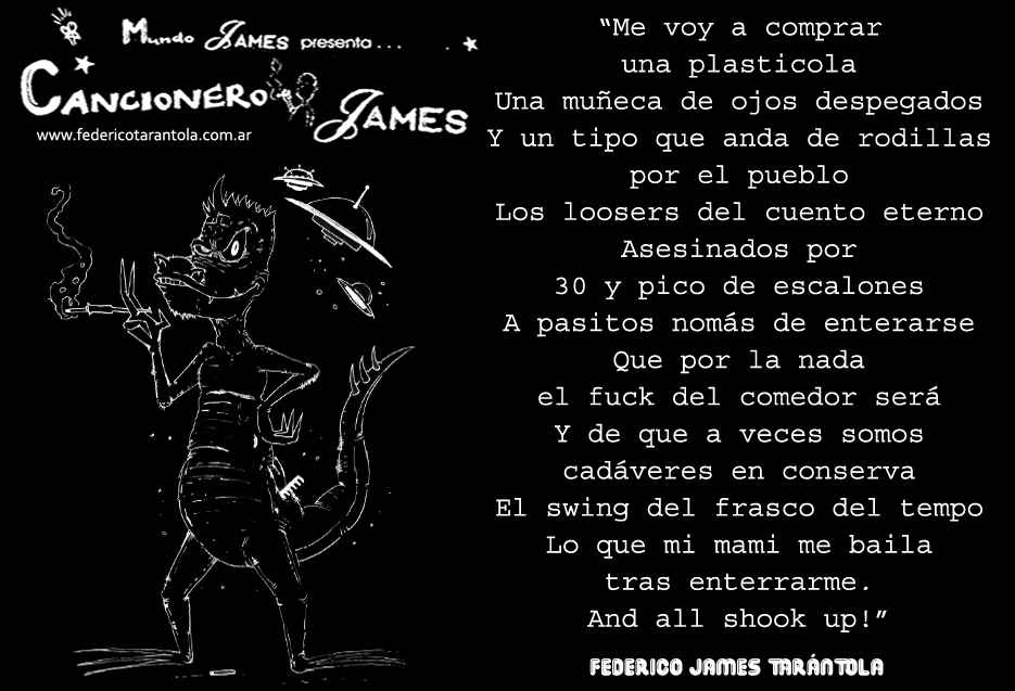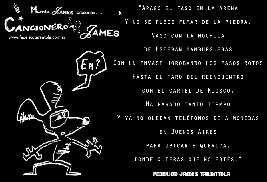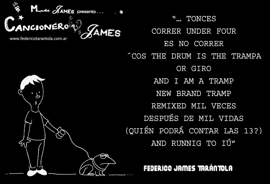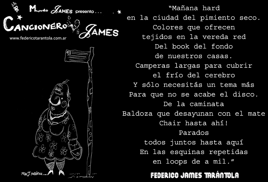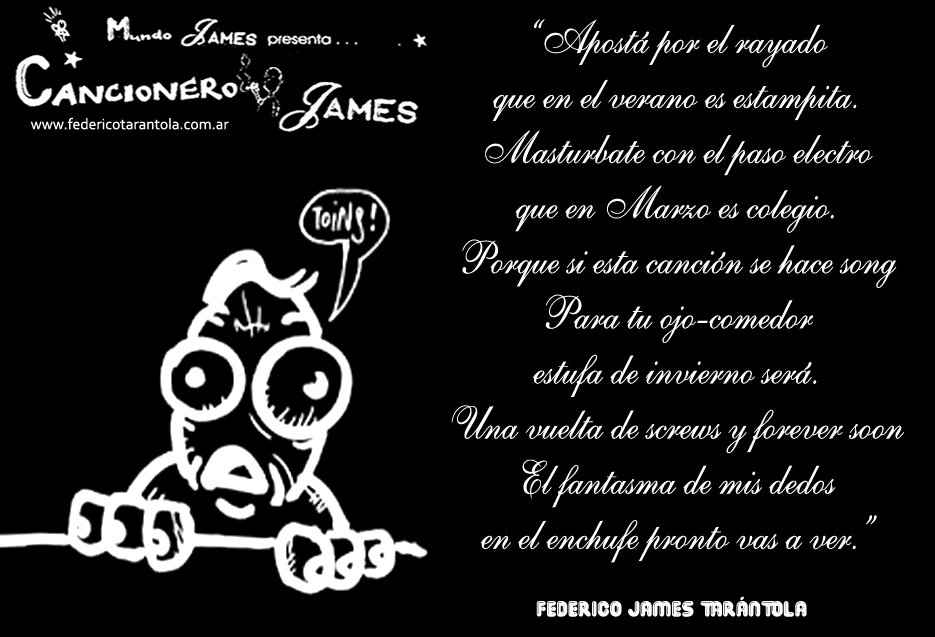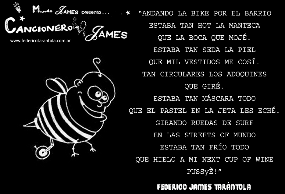 VOS / QUE ME MIRÁS DE COTÉ / CON OJOS DE PALOMA / MIENTRAS COMPARTÍS MALTA & YIT. / CHASQUEANDO LOS DEDOS / TIKI-TIKI-TÍK! / TE DIGO QUE EL PEDAZO QUE CONOZCAS DE MÍ / NO ES ARGUMENTO PARA TU LOCA / LOCA LOCA CANCIÓNg! / AND... ONE, TWO, THREE! / QUE MI BICICLETA NO TENGA STÉREO / NO SIGNIFICA QUE NO TENGA SWING & TOINg! / VOS / PARA VOS / QUE ME MIRÁS DE COTÉ / CON OJOS DE PALOMA / MI PEINADO, MIS MANERAS, MIS CONGESTIÓNgS! / A VECES QUISIERA ESTUDIAR CHINO / DEJAR DE MALTEARME E IRME A LA YIT / Y UNA ALMACÉN EN CHINA TENER. / PERO QUE DIRÁN / QUE DIRÁN ESE DAY TUS OJOS DE PALOMA / LOS OJOS DEL BARRIO / OJOS QUE CUESTIONAN QUE SI ESTOY BIEN, QUE SI ESTOY MAL, QUE SI QUIERO PONERME MEJOR / QUE DIRÁN TUS OJOS DE PALOMA / PARA CUANDO YO EXUDE ARROZ & GOTITAS DE TÉ / EHÉ / AND JÉ!... / JEJEJEJE-JEEEEEEEÉ! (del Inexistente Cuento La Cabaña del Tío James 2013)