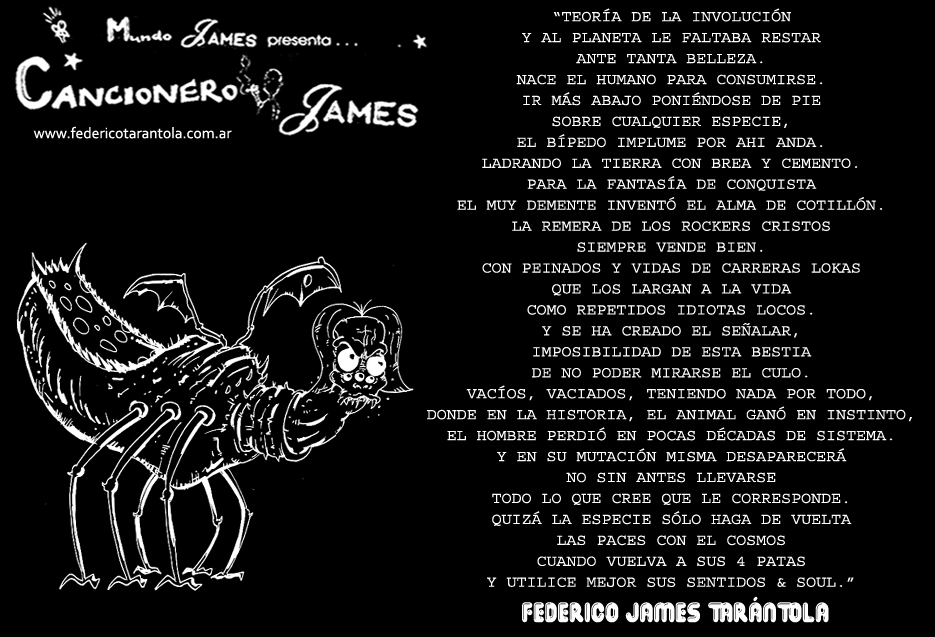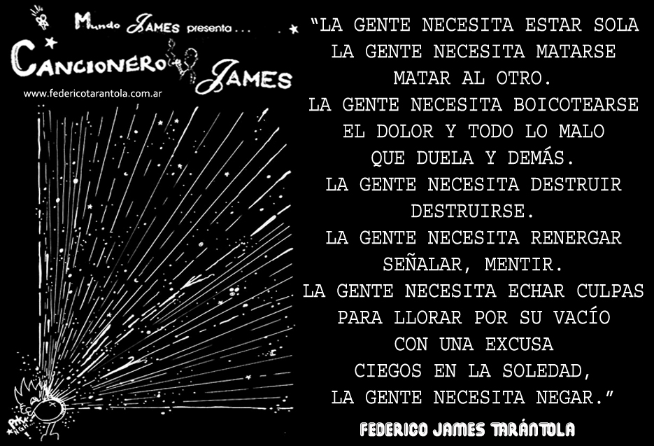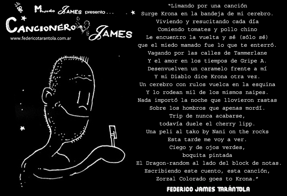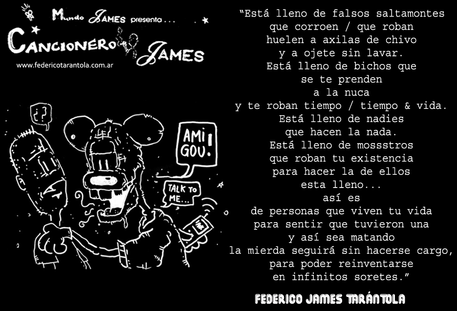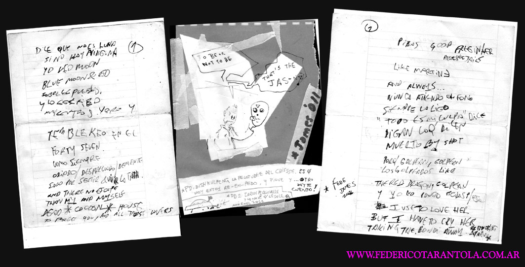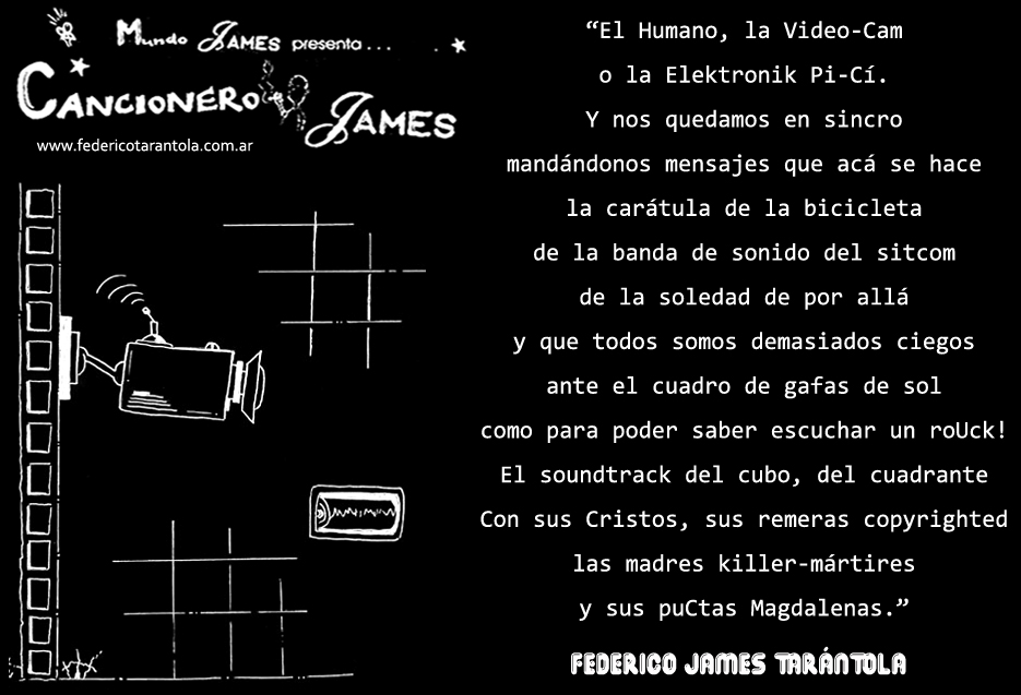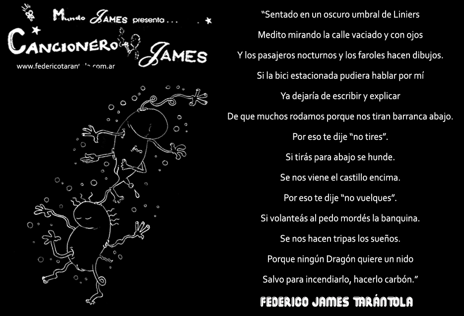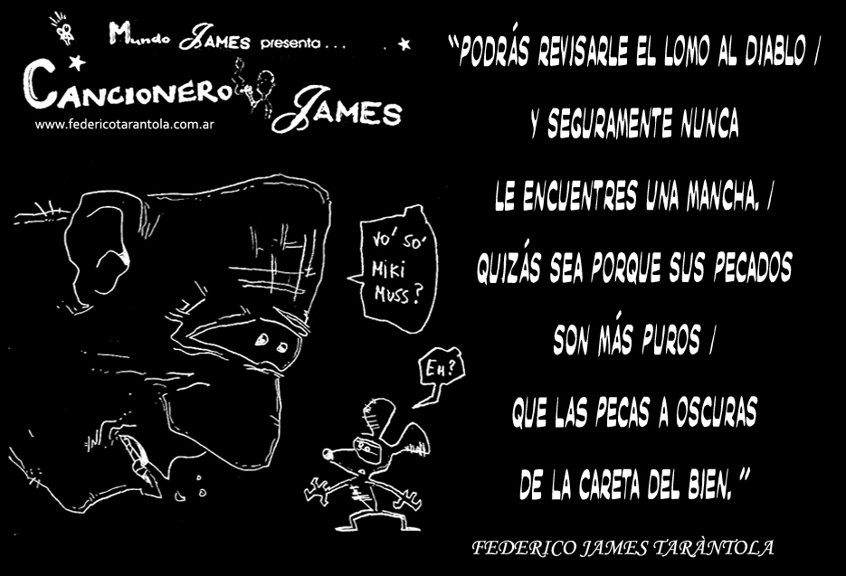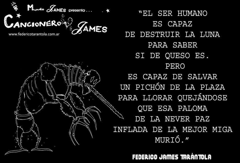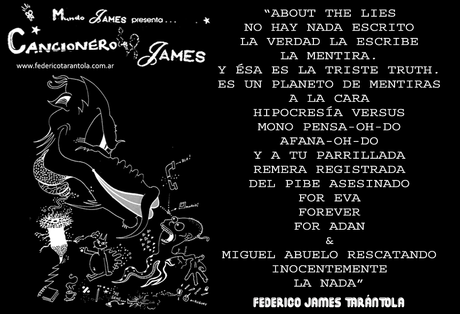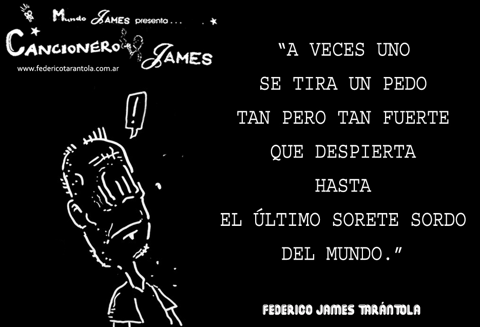 VOS / QUE ME MIRÁS DE COTÉ / CON OJOS DE PALOMA / MIENTRAS COMPARTÍS MALTA & YIT. / CHASQUEANDO LOS DEDOS / TIKI-TIKI-TÍK! / TE DIGO QUE EL PEDAZO QUE CONOZCAS DE MÍ / NO ES ARGUMENTO PARA TU LOCA / LOCA LOCA CANCIÓNg! / AND... ONE, TWO, THREE! / QUE MI BICICLETA NO TENGA STÉREO / NO SIGNIFICA QUE NO TENGA SWING & TOINg! / VOS / PARA VOS / QUE ME MIRÁS DE COTÉ / CON OJOS DE PALOMA / MI PEINADO, MIS MANERAS, MIS CONGESTIÓNgS! / A VECES QUISIERA ESTUDIAR CHINO / DEJAR DE MALTEARME E IRME A LA YIT / Y UNA ALMACÉN EN CHINA TENER. / PERO QUE DIRÁN / QUE DIRÁN ESE DAY TUS OJOS DE PALOMA / LOS OJOS DEL BARRIO / OJOS QUE CUESTIONAN QUE SI ESTOY BIEN, QUE SI ESTOY MAL, QUE SI QUIERO PONERME MEJOR / QUE DIRÁN TUS OJOS DE PALOMA / PARA CUANDO YO EXUDE ARROZ & GOTITAS DE TÉ / EHÉ / AND JÉ!... / JEJEJEJE-JEEEEEEEÉ! (del Inexistente Cuento La Cabaña del Tío James 2013)