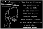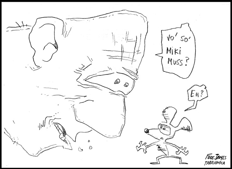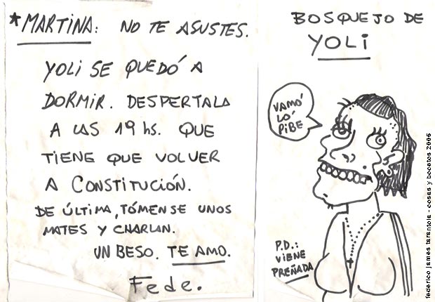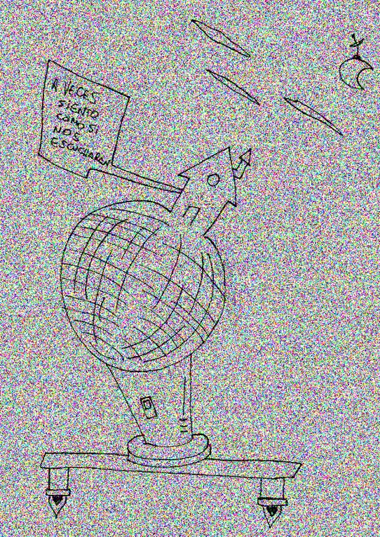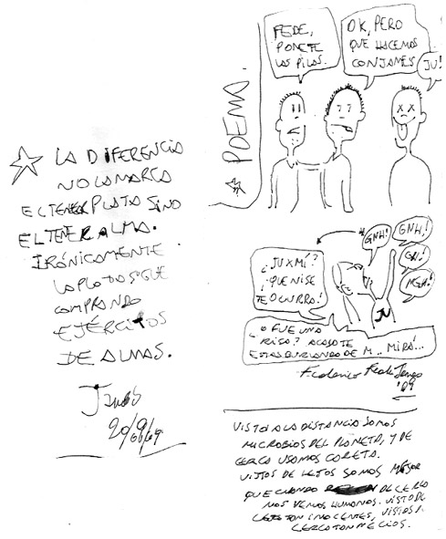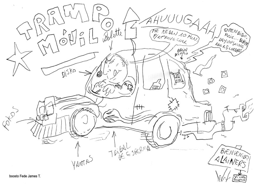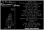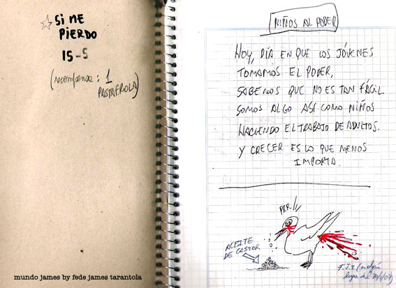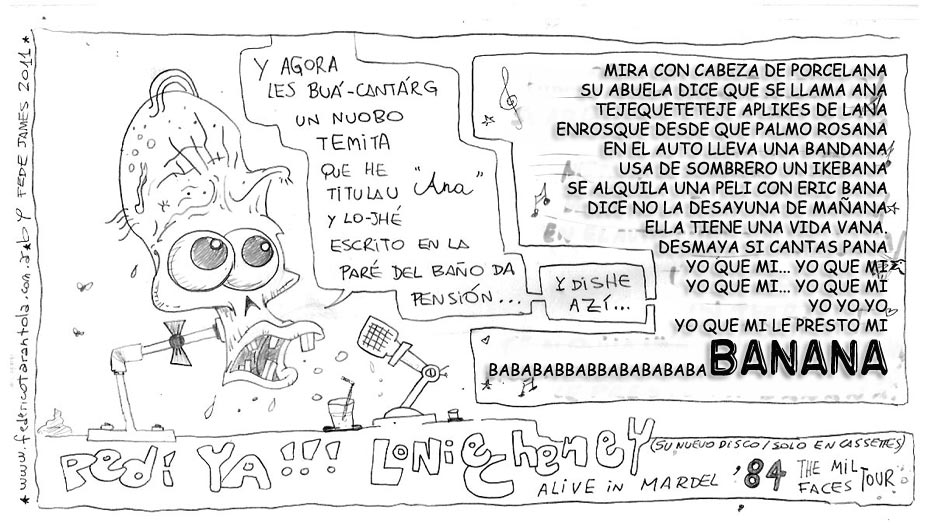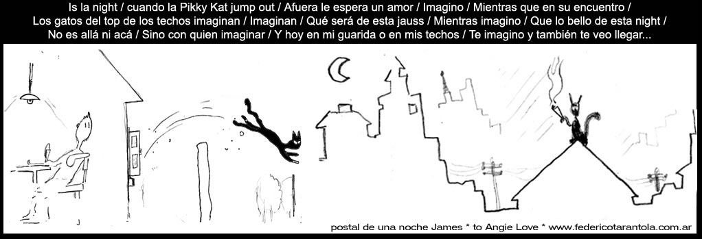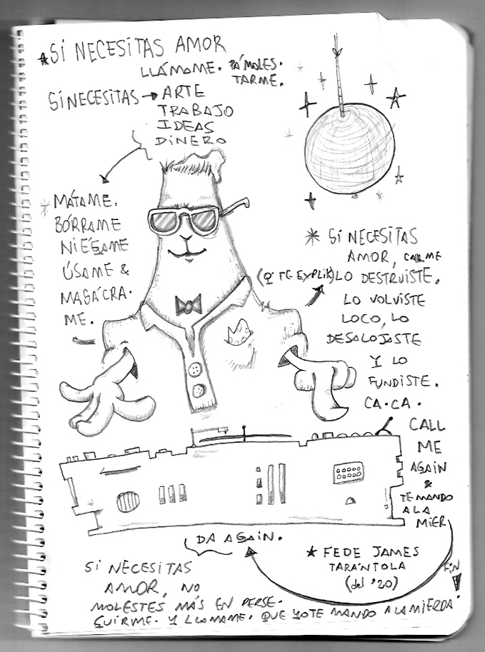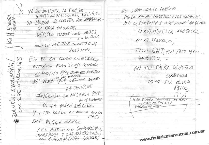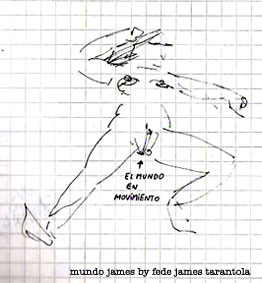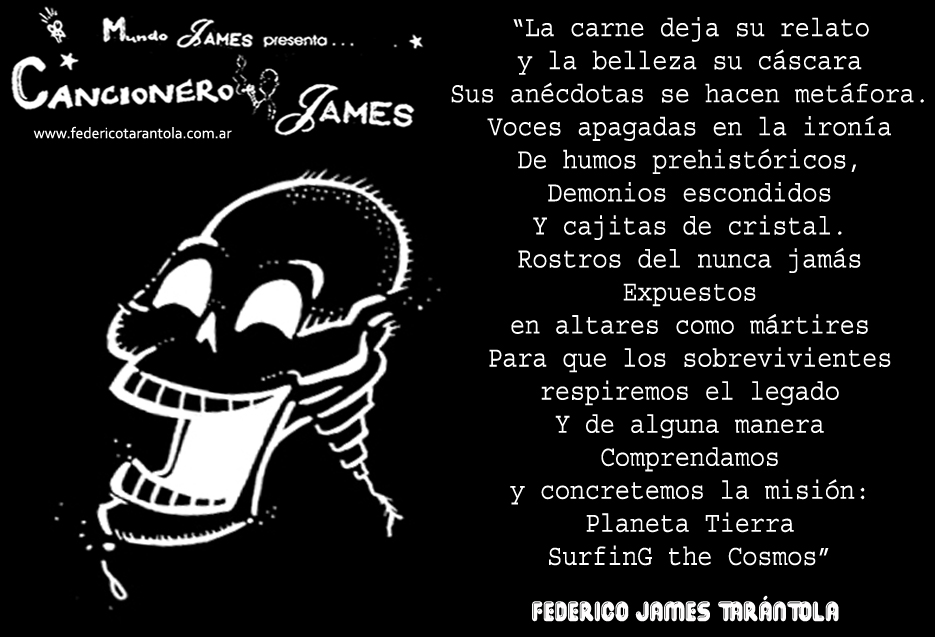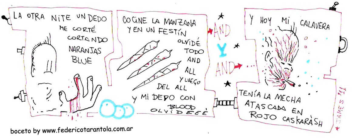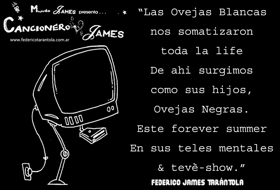 VOS / QUE ME MIRÁS DE COTÉ / CON OJOS DE PALOMA / MIENTRAS COMPARTÍS MALTA & YIT. / CHASQUEANDO LOS DEDOS / TIKI-TIKI-TÍK! / TE DIGO QUE EL PEDAZO QUE CONOZCAS DE MÍ / NO ES ARGUMENTO PARA TU LOCA / LOCA LOCA CANCIÓNg! / AND... ONE, TWO, THREE! / QUE MI BICICLETA NO TENGA STÉREO / NO SIGNIFICA QUE NO TENGA SWING & TOINg! / VOS / PARA VOS / QUE ME MIRÁS DE COTÉ / CON OJOS DE PALOMA / MI PEINADO, MIS MANERAS, MIS CONGESTIÓNgS! / A VECES QUISIERA ESTUDIAR CHINO / DEJAR DE MALTEARME E IRME A LA YIT / Y UNA ALMACÉN EN CHINA TENER. / PERO QUE DIRÁN / QUE DIRÁN ESE DAY TUS OJOS DE PALOMA / LOS OJOS DEL BARRIO / OJOS QUE CUESTIONAN QUE SI ESTOY BIEN, QUE SI ESTOY MAL, QUE SI QUIERO PONERME MEJOR / QUE DIRÁN TUS OJOS DE PALOMA / PARA CUANDO YO EXUDE ARROZ & GOTITAS DE TÉ / EHÉ / AND JÉ!... / JEJEJEJE-JEEEEEEEÉ! (del Inexistente Cuento La Cabaña del Tío James 2013)