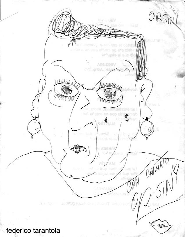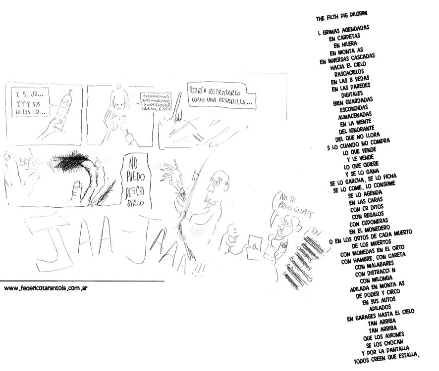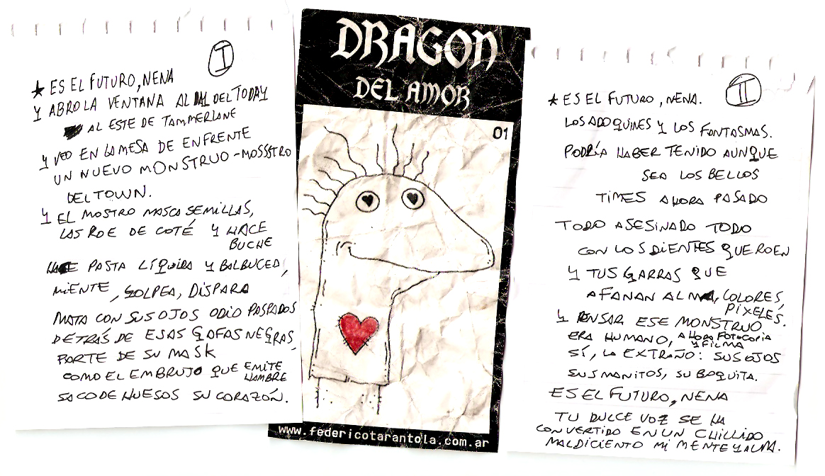 Tentado por el frío / Tentando al fuego, el humo / y las letras en ángulo picado / Anahì. / Adn en la lengua / mùsculos laterales la ponen como flecha. / Gime y miente en el tiempo / 365 days ago / una de las pocas nites de coño y lefas. El fantasma replicado en loop en el futuro / Dice, Hace, Repite / como Lora / Mata, se mata, me mata como en mis sueños / que me despabilan, pesadillas. Eternas quesadillas de su alma inquita de odio / y después todo lo traga / con cuchara, empanado como milanesas. / Y el barrio que le dice "Nena, por hacerte la linda y buena, no tenès por qué traernos la Yuta".