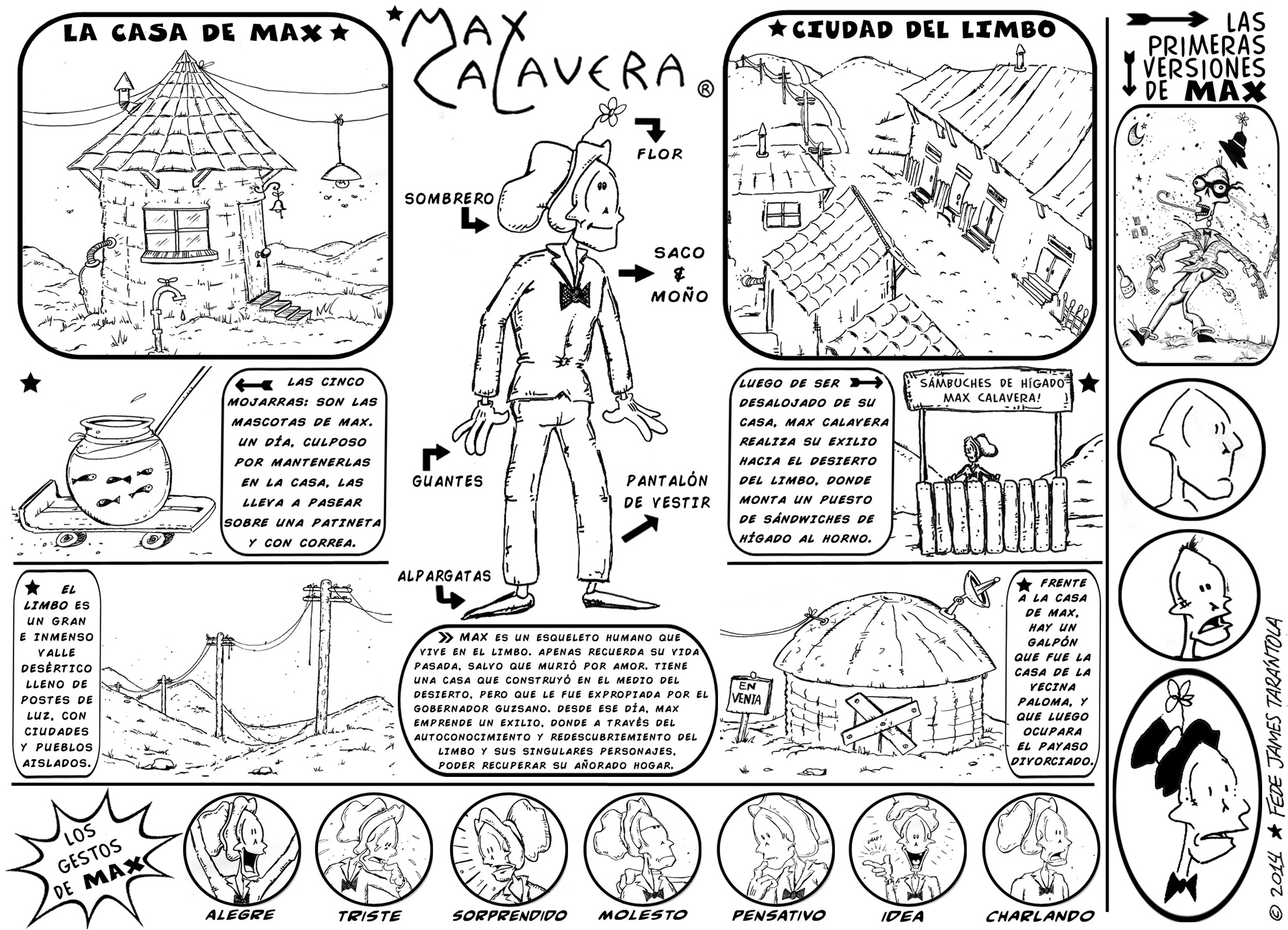 MAX es solitario, pensativo, amante de los temas existencialistas. Tiene como mascotas una pecera con 5 mojarras que pasea con correa sobre su patineta. Max es dulce, ingenuo, y el interlocutor ideal de los personajes que vagan por los desiertos y ciudades del Limbo.