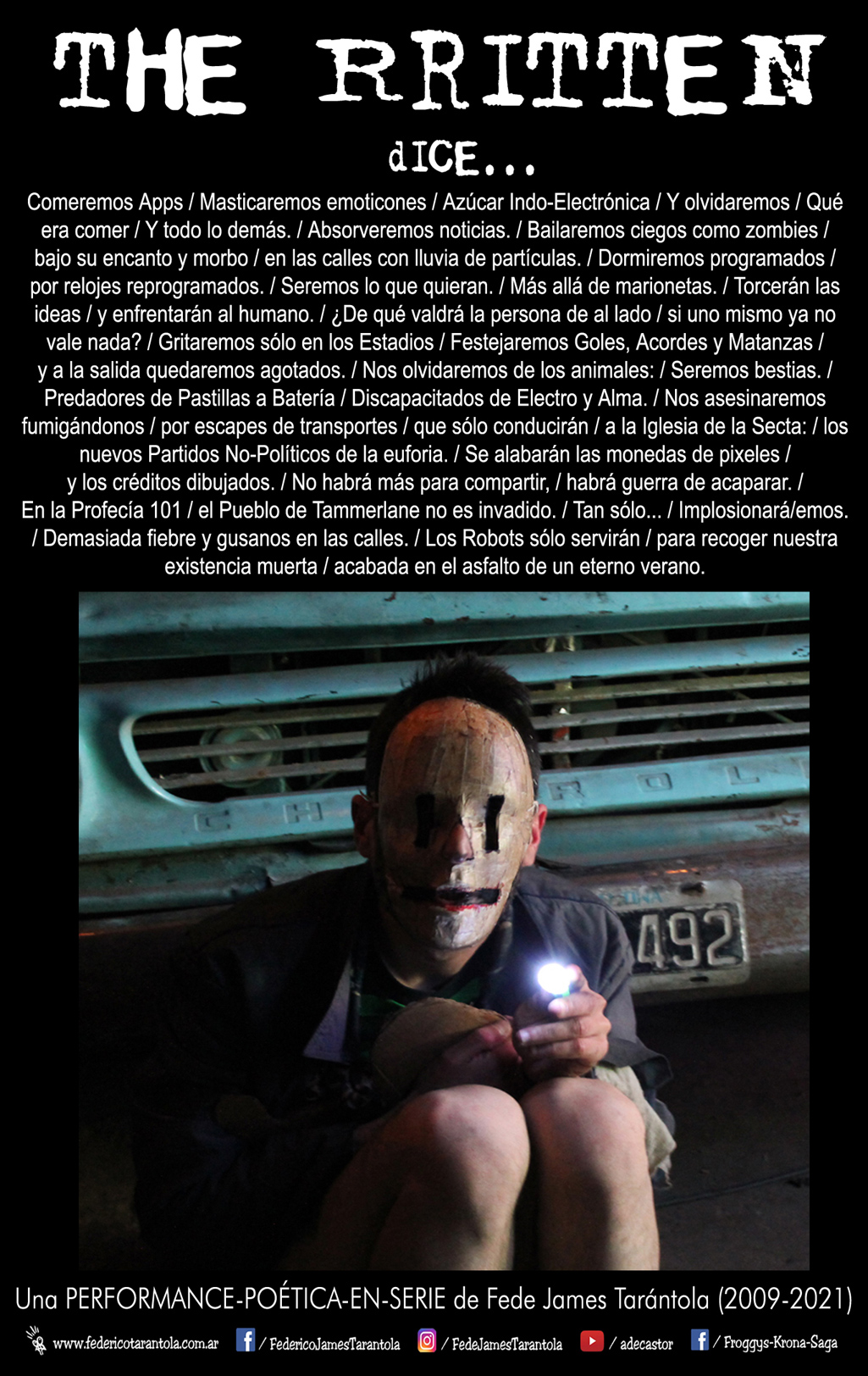 Comeremos Apps / Masticaremos emoticones / Azúcar Indo-Electrónica / Y olvidaremos / Qué era comer / Y todo lo demás. / Absorveremos noticias. / Bailaremos ciegos como zombies / bajo su encanto y morbo /